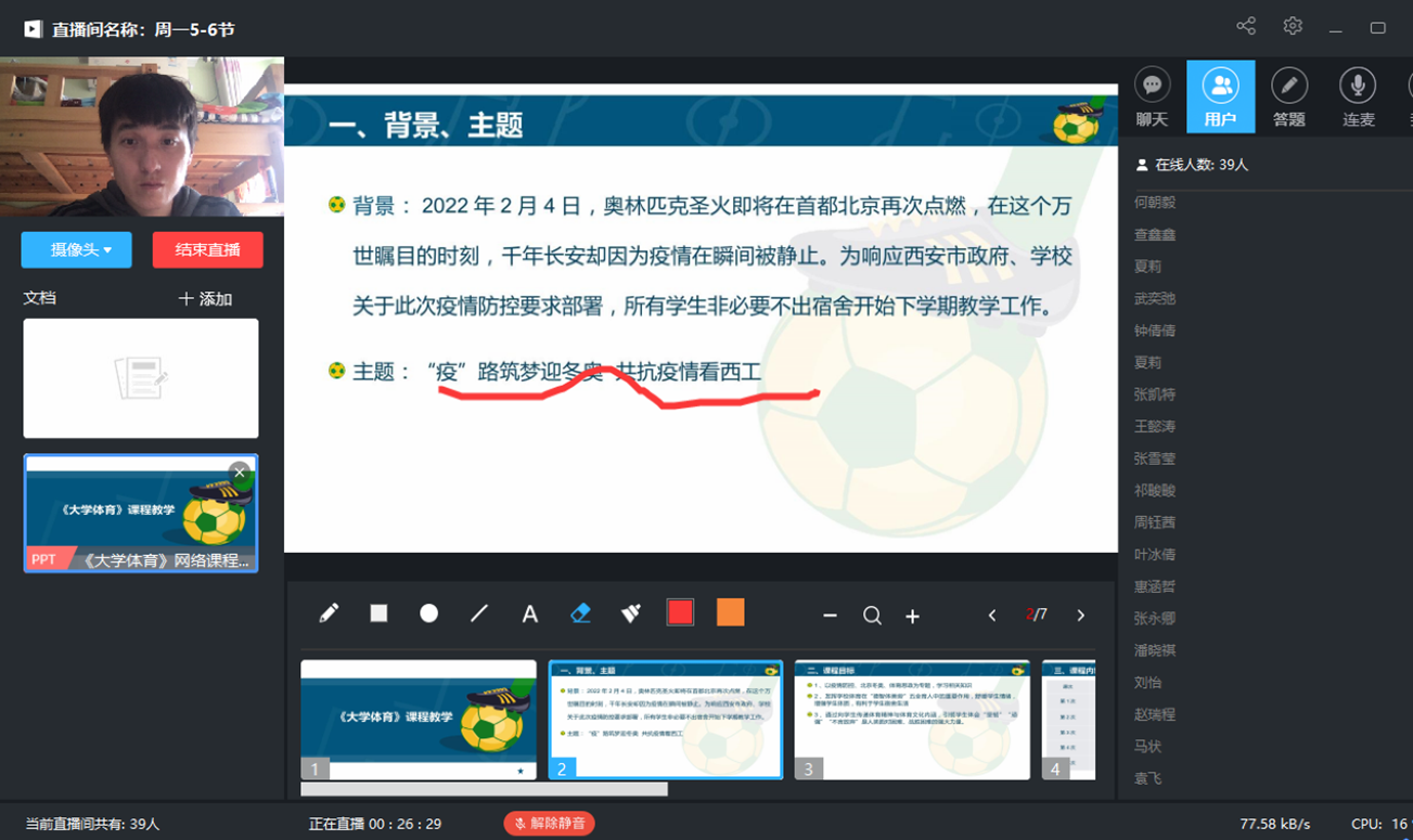 制定线上体育教学实施方案,围绕““疫”路筑梦迎冬奥,共抗疫情看西工”主题,设计体育课教学内容,使学生通过课程学习,掌握体育运动技能,课后,给学生安排开展丰富多彩的课余训练和活动,让学生在疫情封控期间,利用宿舍器材及用品进行锻炼,在体育锻炼中享受乐趣、增强体质抗击疫情、健全人格、锤炼意志。