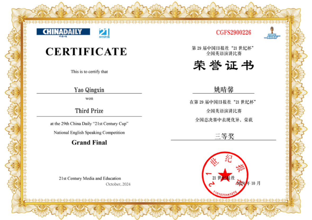2023级姚晴馨同学获得全国三等奖,实现草莓视频