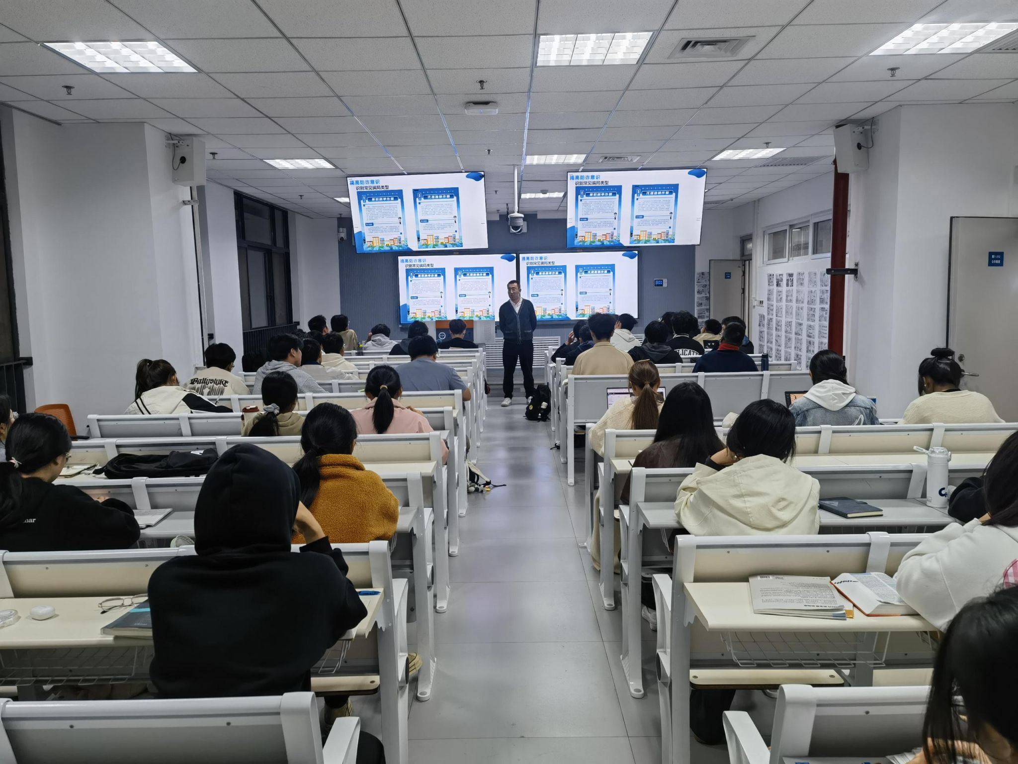 会上,各社区辅导员讲述了多种校内常见诈骗手段,涉及冒充亲友要求转账、网络购物陷阱、网络贷款诈骗、刷单返利骗局、网络交友风险以及冒充学校工作人员进行诈骗等,介绍了此类诈骗案例的主要特征、甄别技巧与应对方法。通过剖析学生身边的真实案例,提醒同学们要时刻保持警惕,不为任何利益或诱惑所动摇。