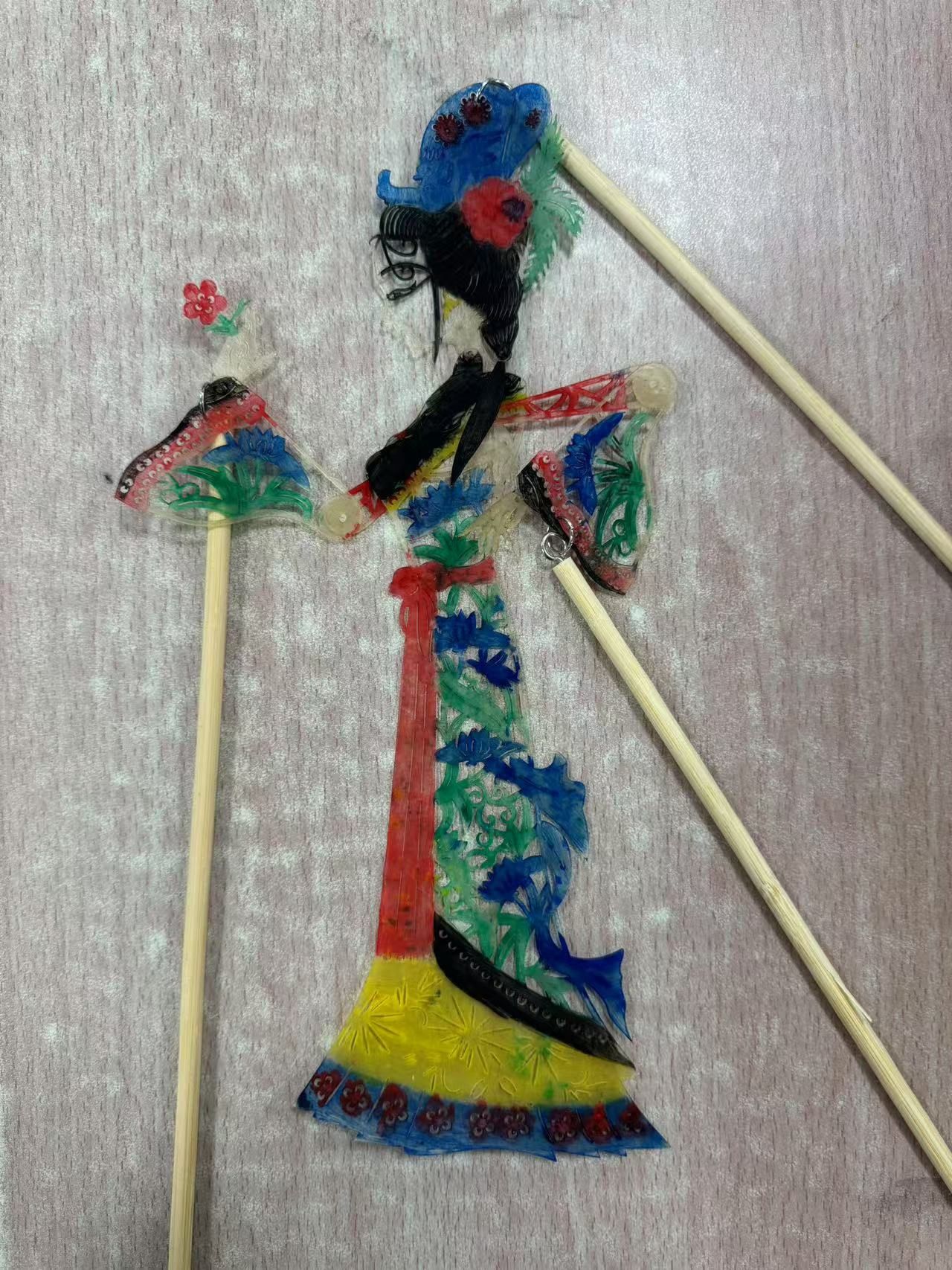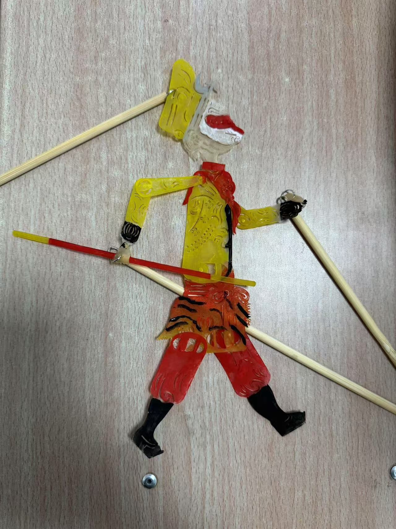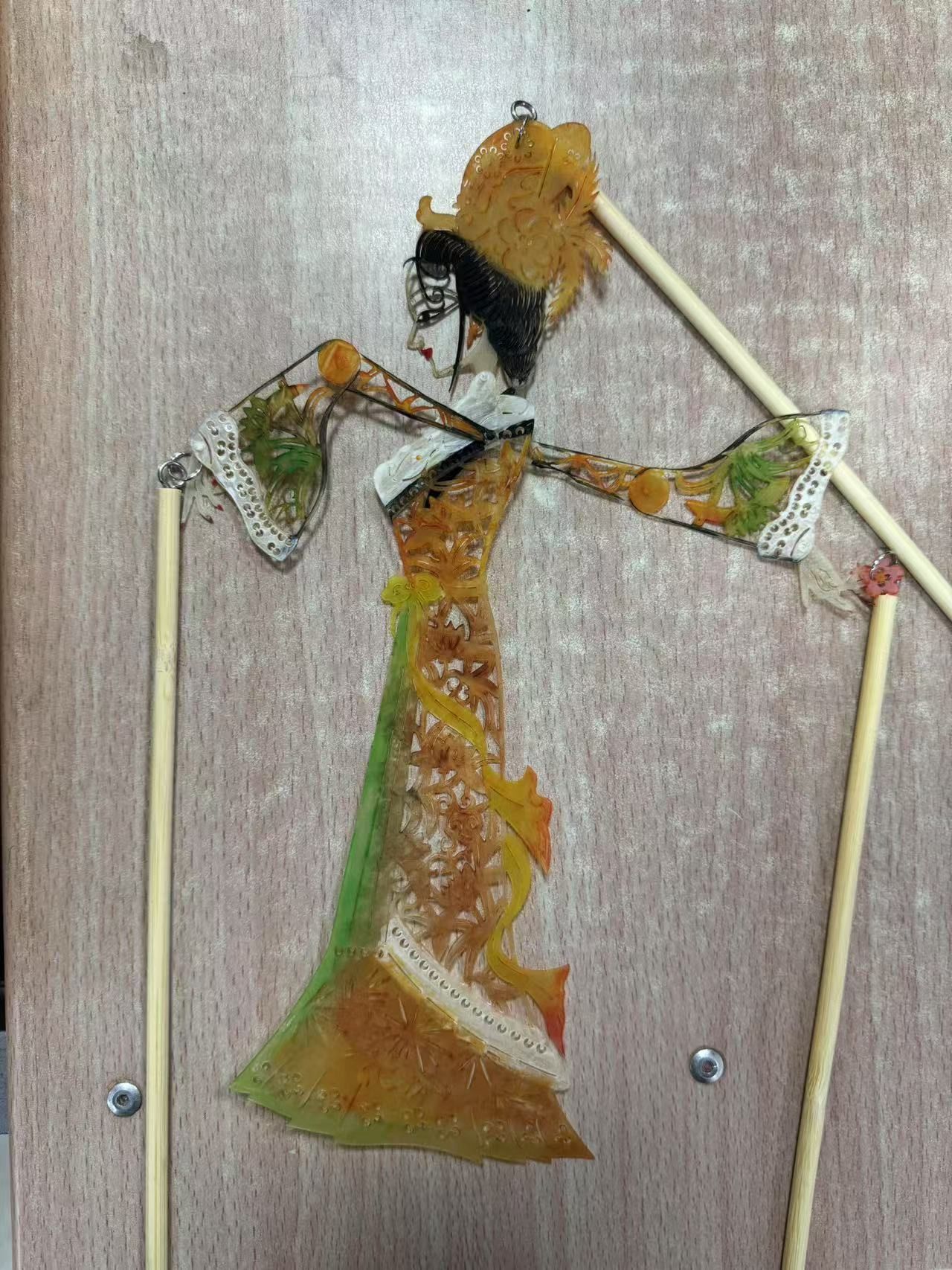 随后,传承人展示了多件精美的皮影成品。在柔和的灯光下,那些用牛皮精心雕刻而成的人物,色彩艳丽、造型生动,引得现场阵阵惊叹。为了让大家更直观感受皮影表演的魅力,传承人还在现场演绎了皮影的控制要领,现场氛围浓厚。