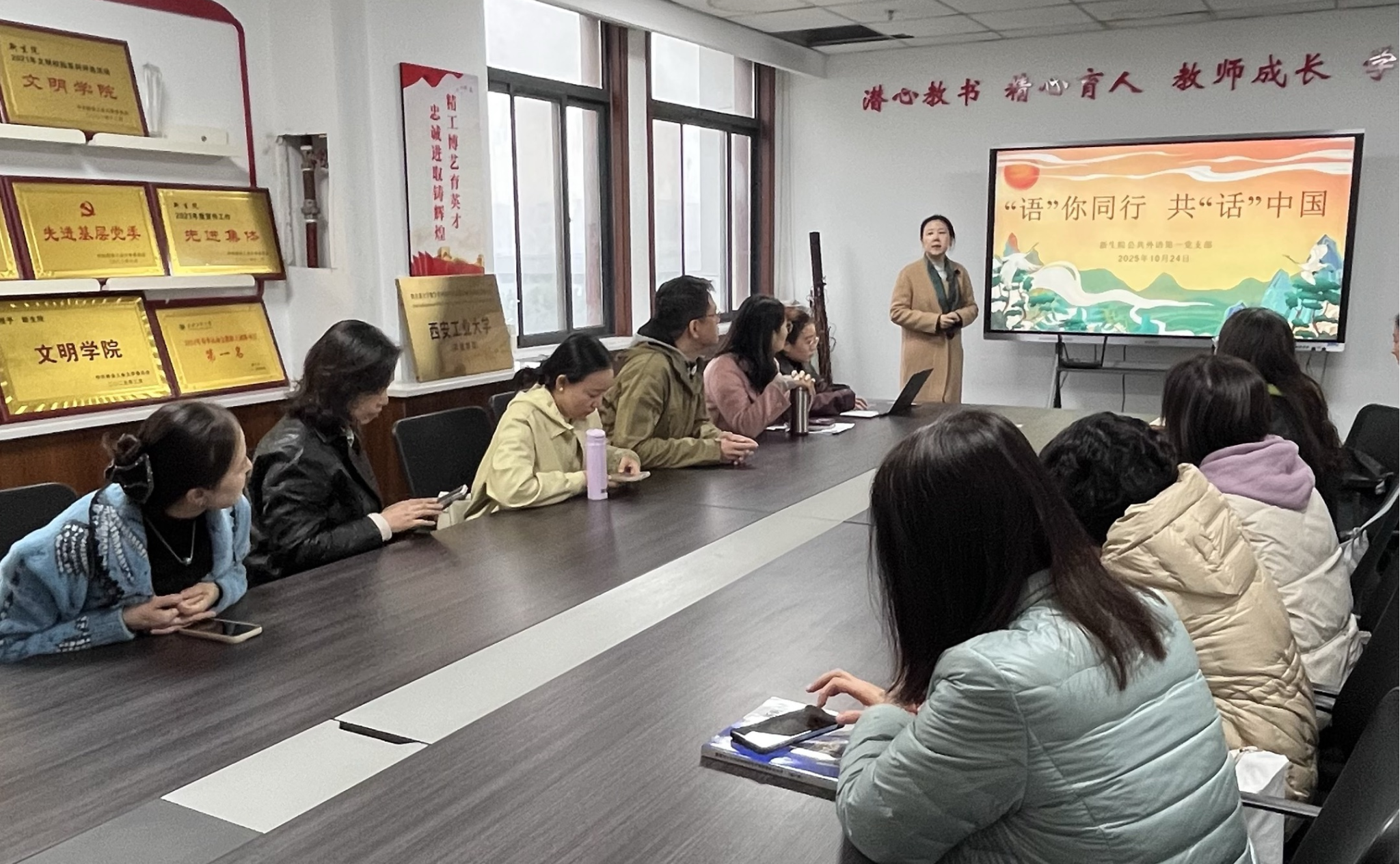 为深入学习贯彻习近平文化思想,创新党建与业务融合路径,推动中国文化的多语种传播,2025年10月24日,公共外语第一党支部组织开展“语”你同行,共“话”中国用外语讲中国故事主题党日活动。支部党员齐聚一堂,以英语、法语等语言为桥梁,将红色精神、时代声音与传统文化融入生动讲述,让中国故事在多语种表达中焕发独特魅力。
