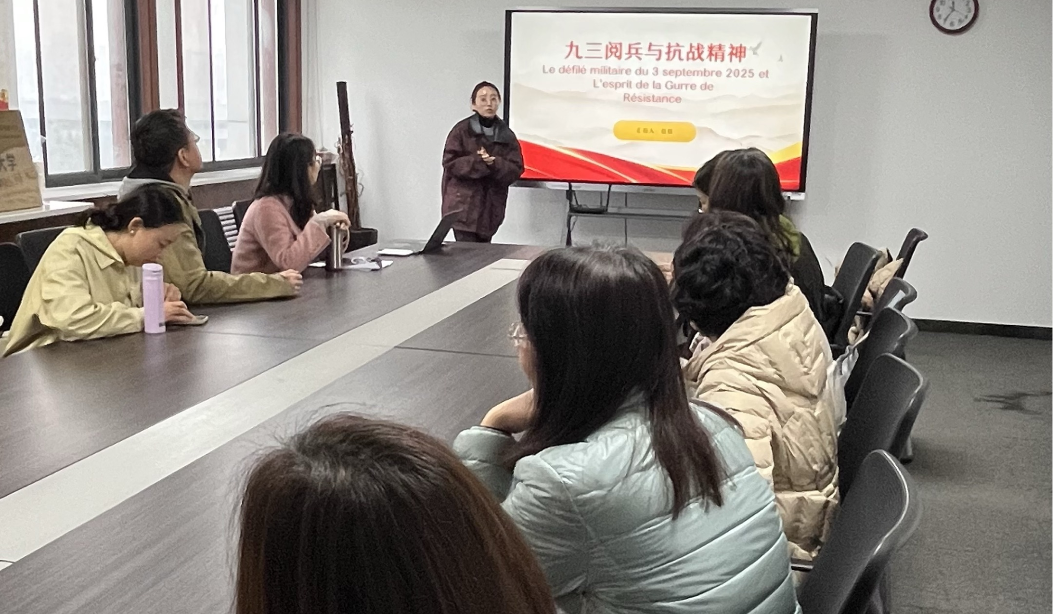 聂晨同志以法语为载体,带领大家重温2025年纪念中国人民抗日战争暨世界反法西斯战争胜利80周年大阅兵的震撼场景。她通过清晰的法语表述,回顾阅兵式上展现的国威军威,深入解读“铭记历史、缅怀先烈、珍爱和平、开创未来”的中国精神,让在场教师在异国语言中更深刻地感受国家强大背后的历史担当与民族气节。