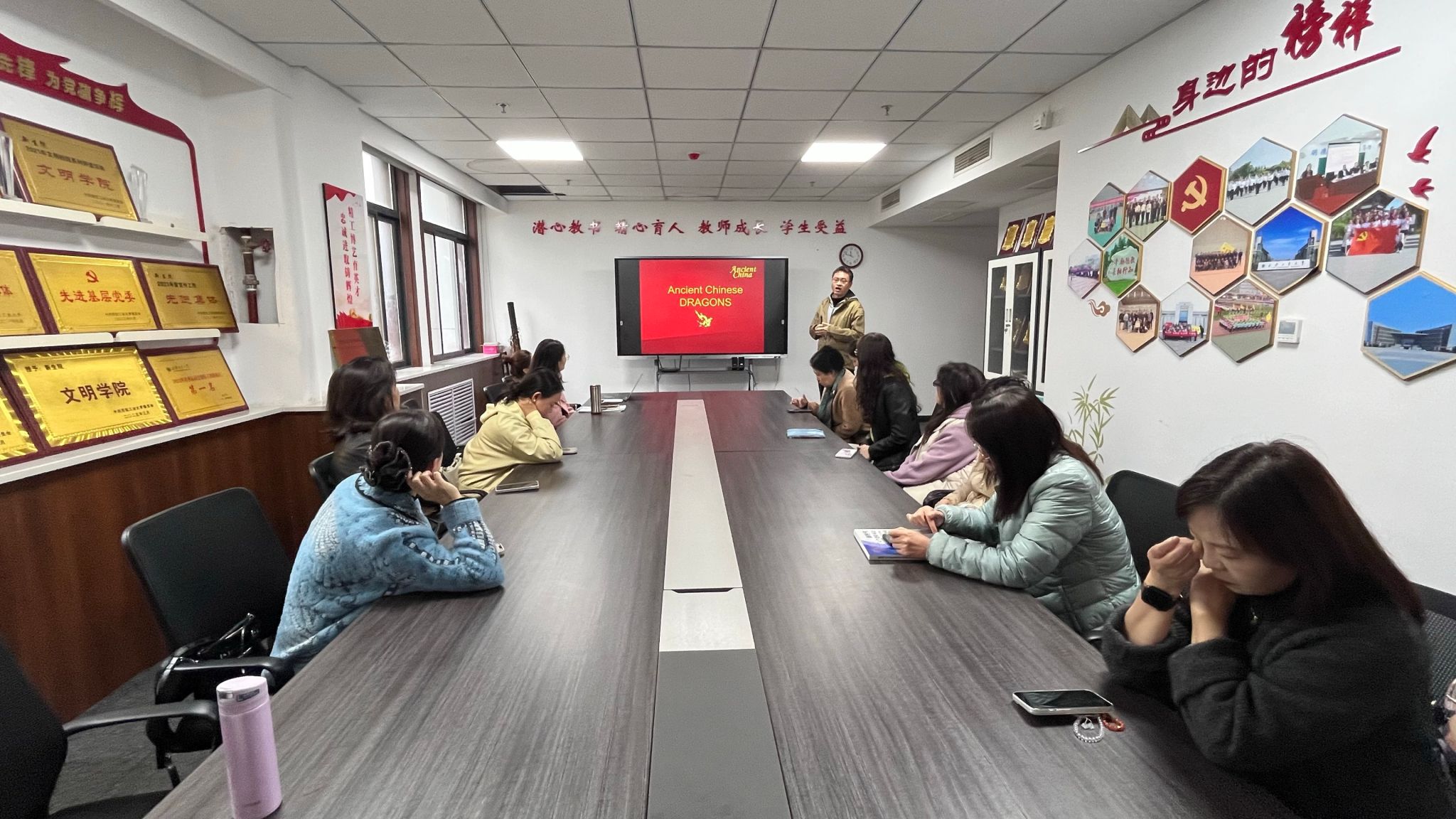 高鹏同志则讲述了中国传统文化中的“龙”元素。用生动的英语表达解读“龙”所象征的吉祥、力量与团结,打破文化隔阂,让大家在熟悉的文化符号中,探索用国际语言传播中国传统文化的新路径,为后续将文化元素融入外语教学提供了新思路。