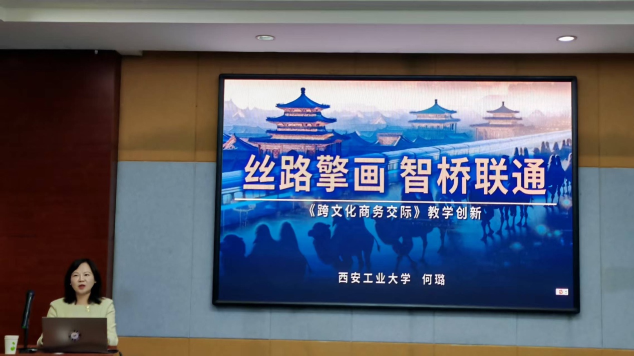 教师何璐是国家级一流本科课程《跨文化商务交际》教学团队负责人。她在本次教学创新设计展示环节进行了题为“丝路擎画、智桥联通:跨文化商务交际教学创新”的实践分享,介绍了通过知识重组、技术赋能、教法创新三者深度融合的路径,将“丝路精神”与“中国智慧”融入课程教学,并运用数智技术为学生架设融通中外商业文化智能桥梁的课程建设和教学改革实践探索。