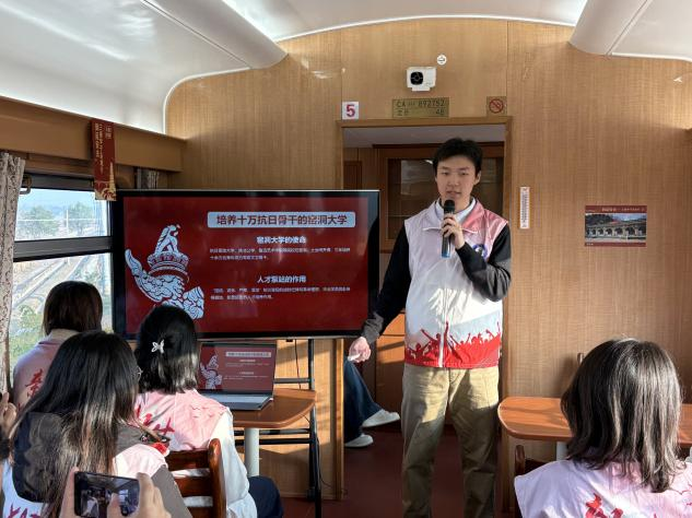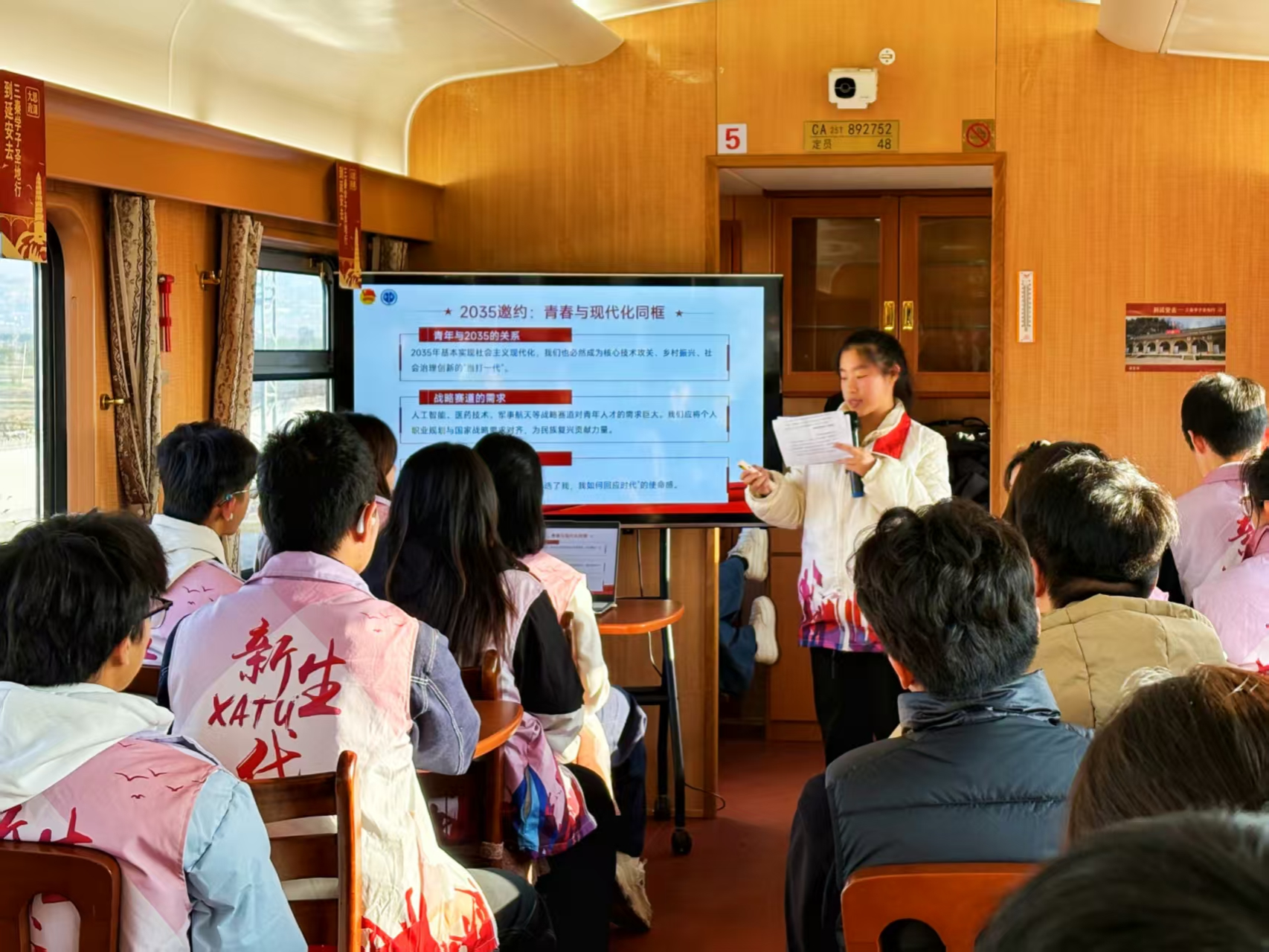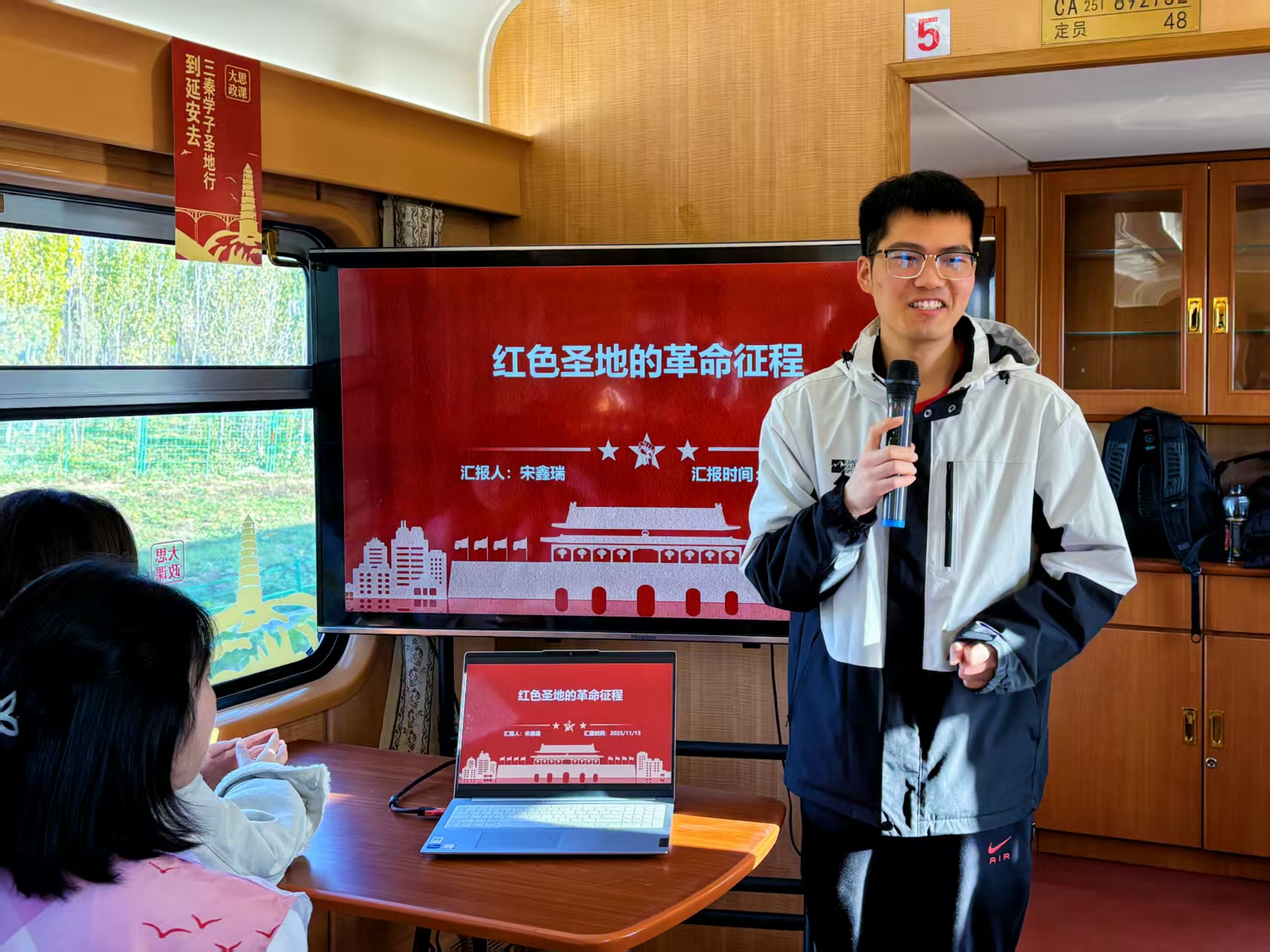 活动伊始,红色专列车厢内“一堂行走的思政课”首先拉开序幕。问凯翔同学以“红色圣地的革命征程”为题,从落脚延安到薪火延续,系统讲述了延安的红色故事;董珏湘同学围绕“窑洞灯火映初心,真理之书照征程”,回顾了不同时期青年的责任担当;宋鑫瑞同学介绍了宝塔山等革命圣地,为即将开启的实践活动奠定了坚实基础。随后,同学们齐唱红歌、共话革命往事,感受红色氛围。