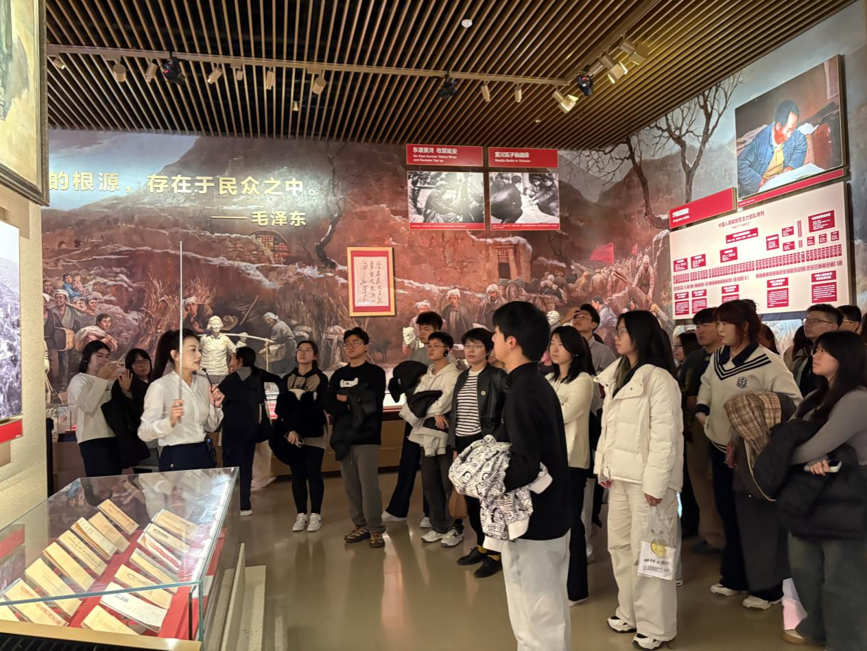 第二站参观延安革命纪念馆。大厅内伟人雕塑与山河浮雕交相辉映,同学们沿着展览脉络,先后参观了“中共中央红军长征的落脚点”“中国人民抗日战争的政治指导中心”“创建新民主主义的模范试验区”等七大模块,从红军长征会师到抗日民族统一战线建立,从大生产运动到延安整风运动,从毛泽东思想的确立到夺取全国胜利,一幅幅泛黄的图片、一件件锈迹斑斑的实物、一段段感人至深的影像资料,生动再现了延安时期波澜壮阔的革命历程,让同学们深刻认识到延安精神的丰富内涵与时代价值。