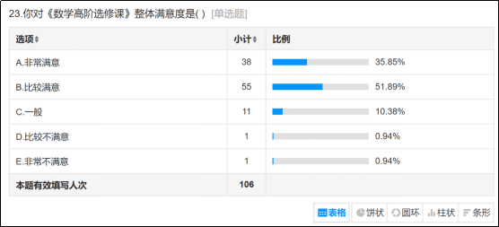 二是以服务学生考研需求为目标,面向大二、大三学生开设《数学高阶选修课》分为春季基础课程、暑期强化训练、秋季冲刺课程三个连续阶段,有力提升学生考研数学成绩。所发放的调查问卷结果显示,学生对高阶选修课满意度非常高。