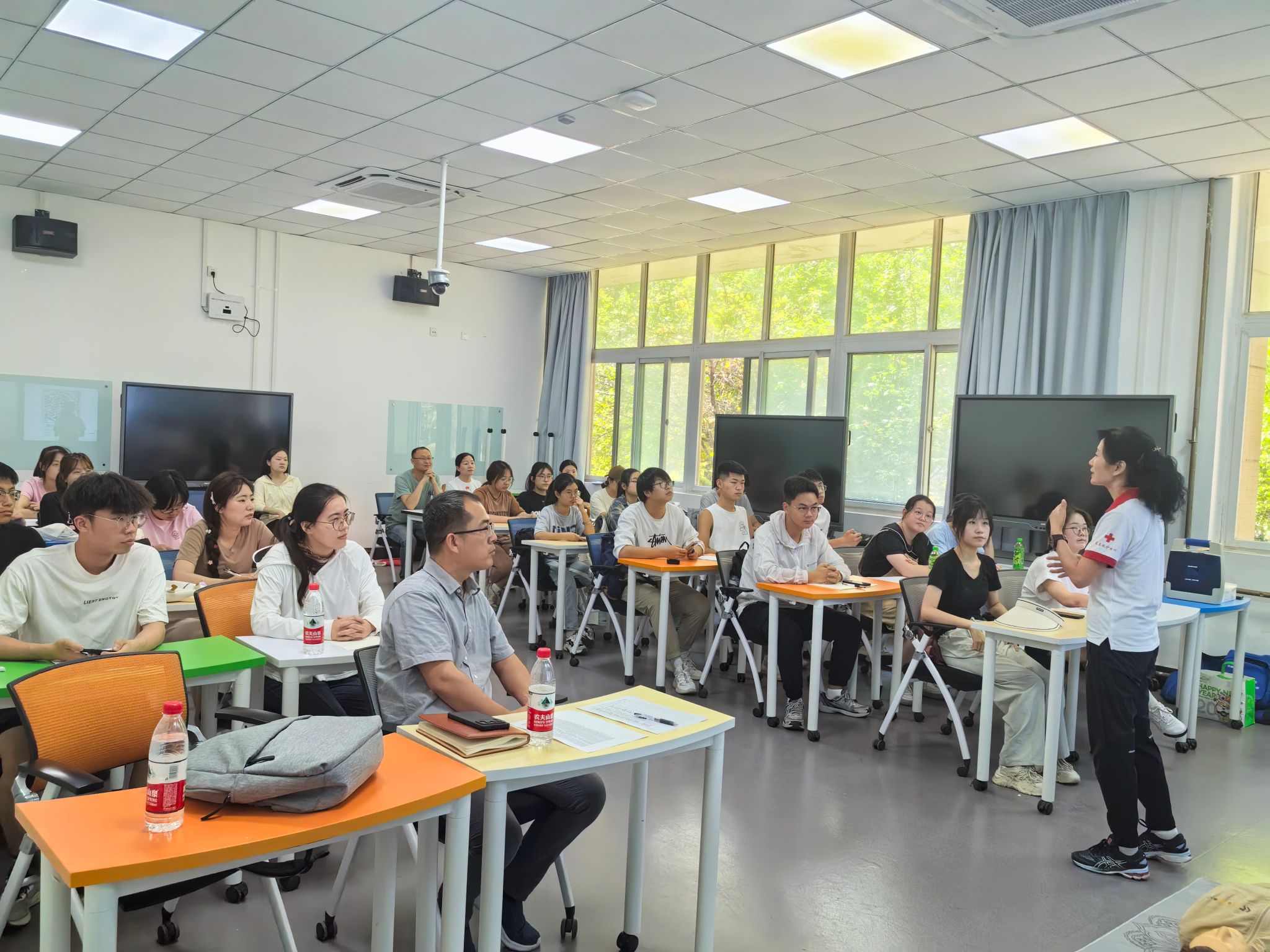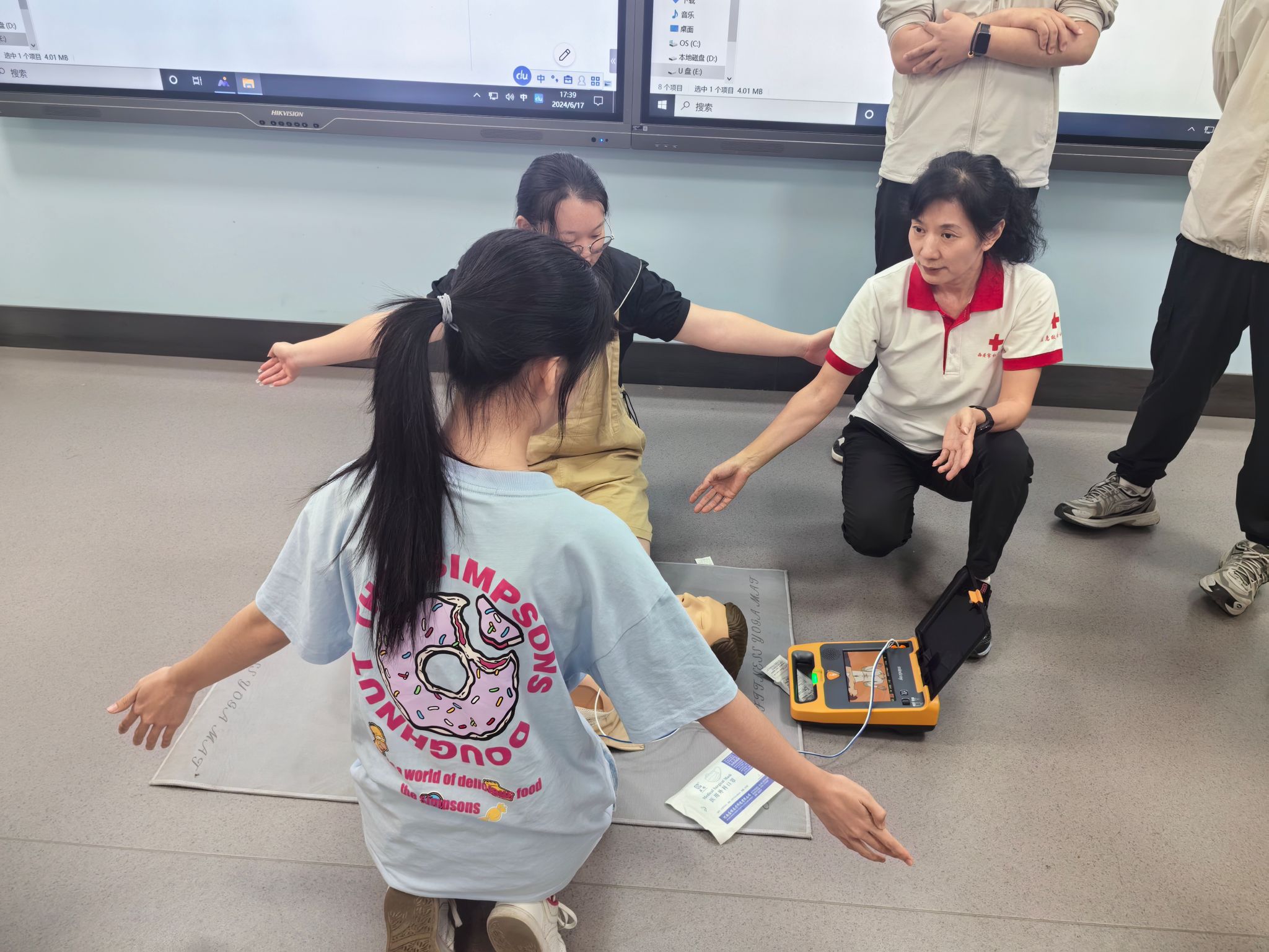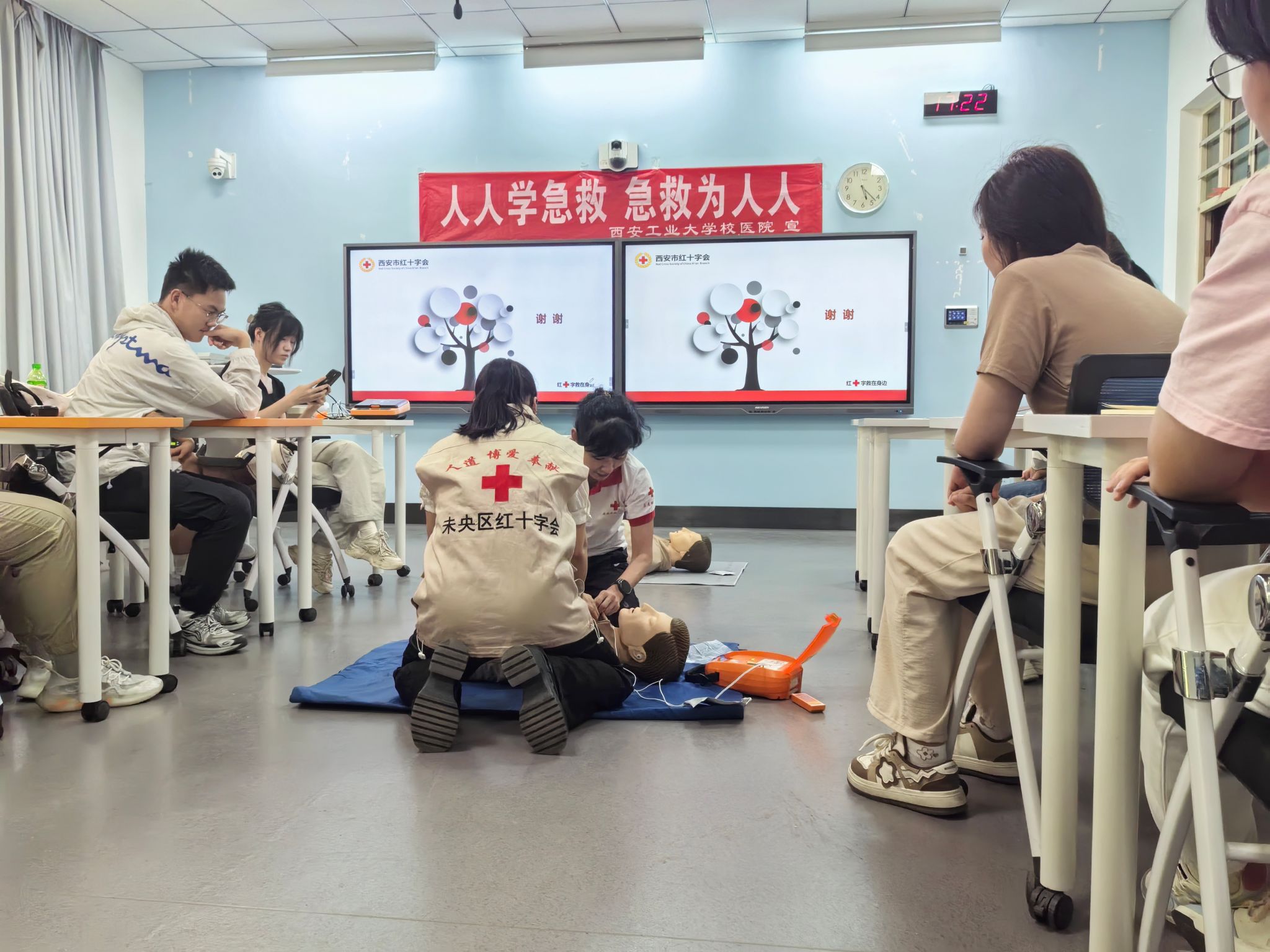 西安市红十字会的医护人员首先向大家强调了急救知识的重要性,详细讲解了心肺复苏(CPR)和自动体外除颤器(AED)的操作流程和注意事项,并通过模拟演示让学生们更直观地了解急救过程。在医护人员的悉心指导下,师生分成若干小组,轮流进行心肺复苏(CPR)和自动体外除颤器(AED)操作练习。医护人员耐心指导,确保每位师生都能熟练掌握正确的急救技能。