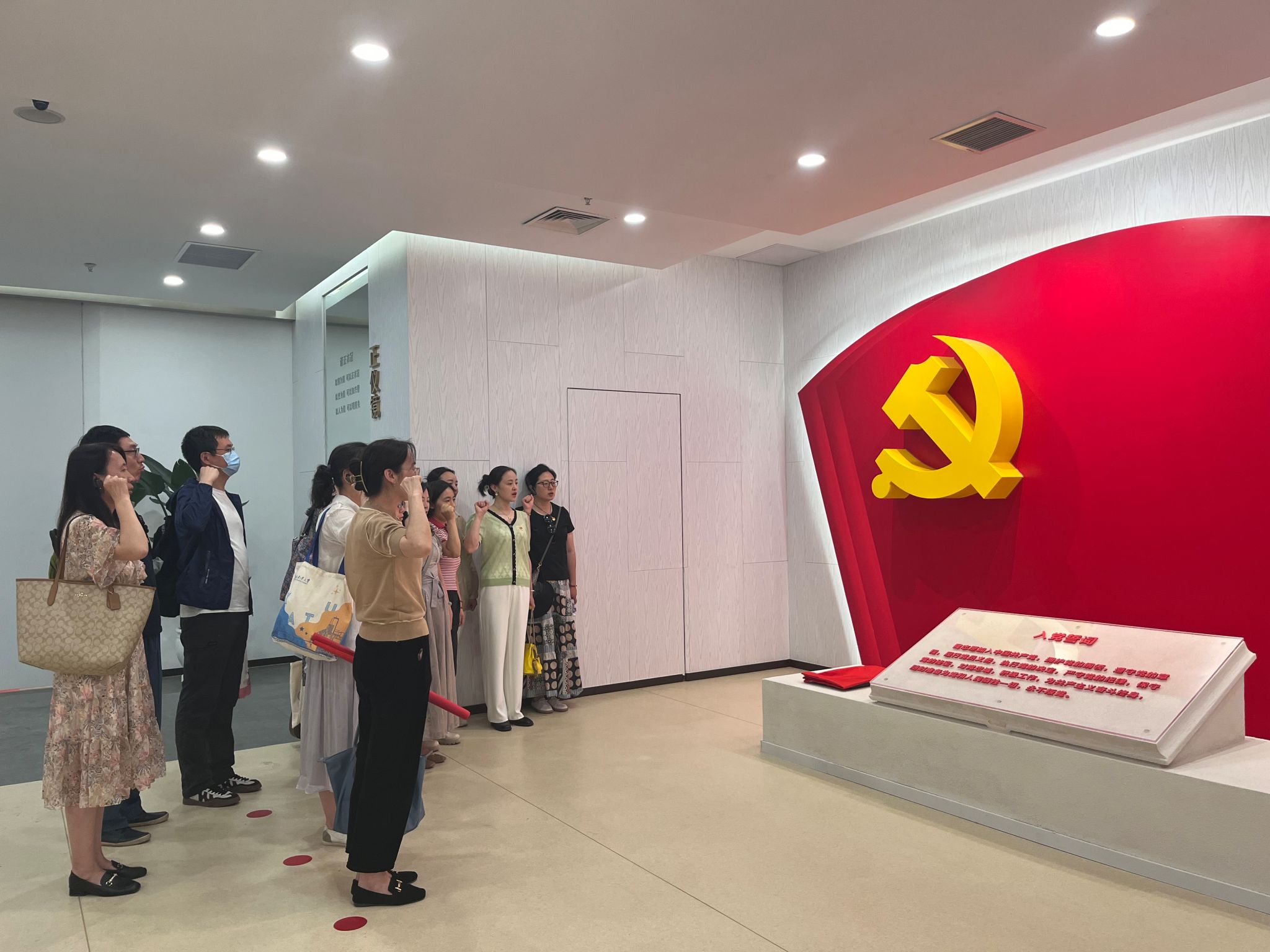 在参观活动的最后,党员同志们来到党旗前,庄严的重温入党誓词。大家纷纷表示会时刻保持清醒的头脑,筑牢拒腐防变的思想防线。知敬畏、存戒惧、守底线,坚持不忘初心、牢记使命,以实际行动践行忠诚、干净、担当。此次活动对支部所有党员来说是一次深刻的思想洗礼和党性锻炼。
