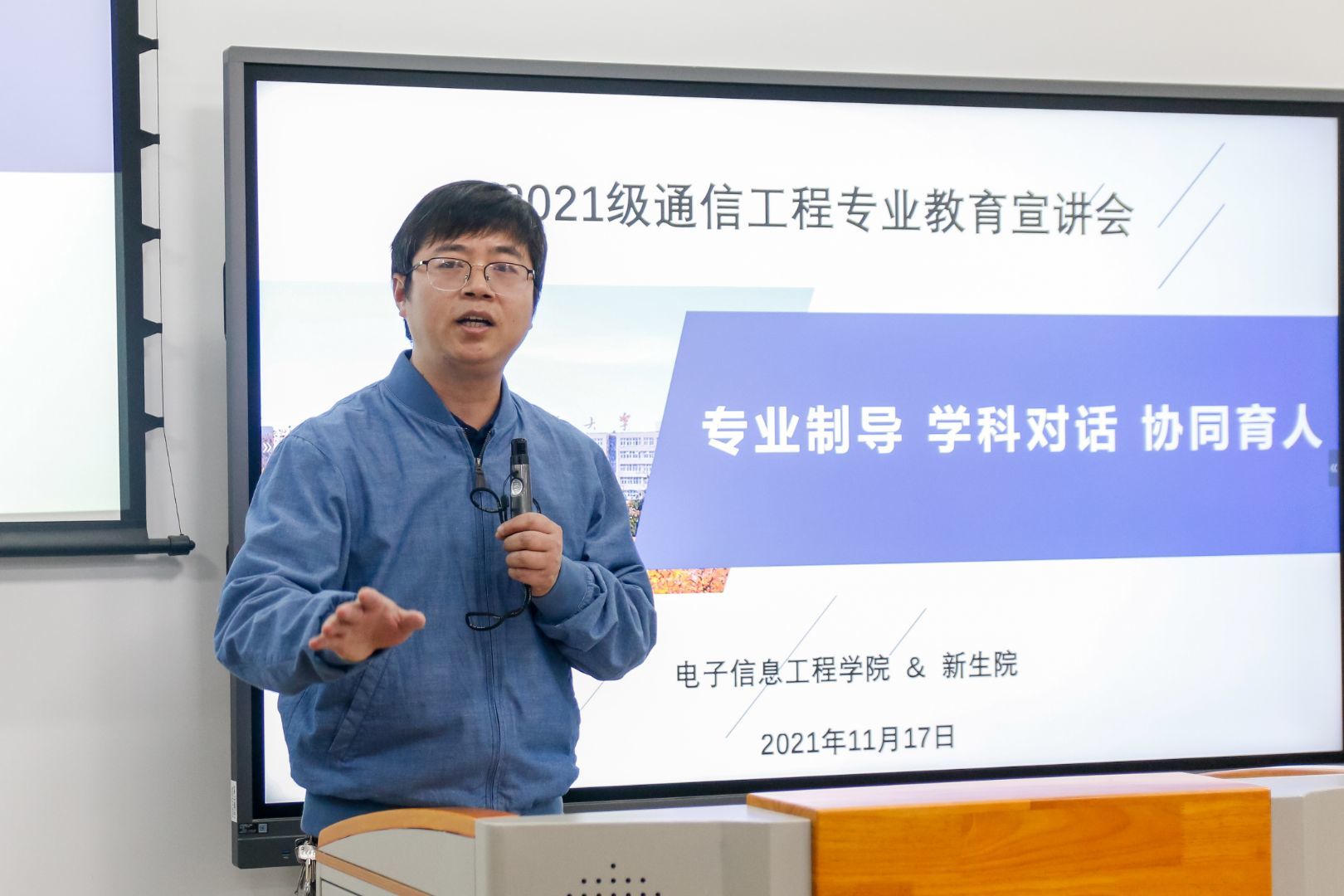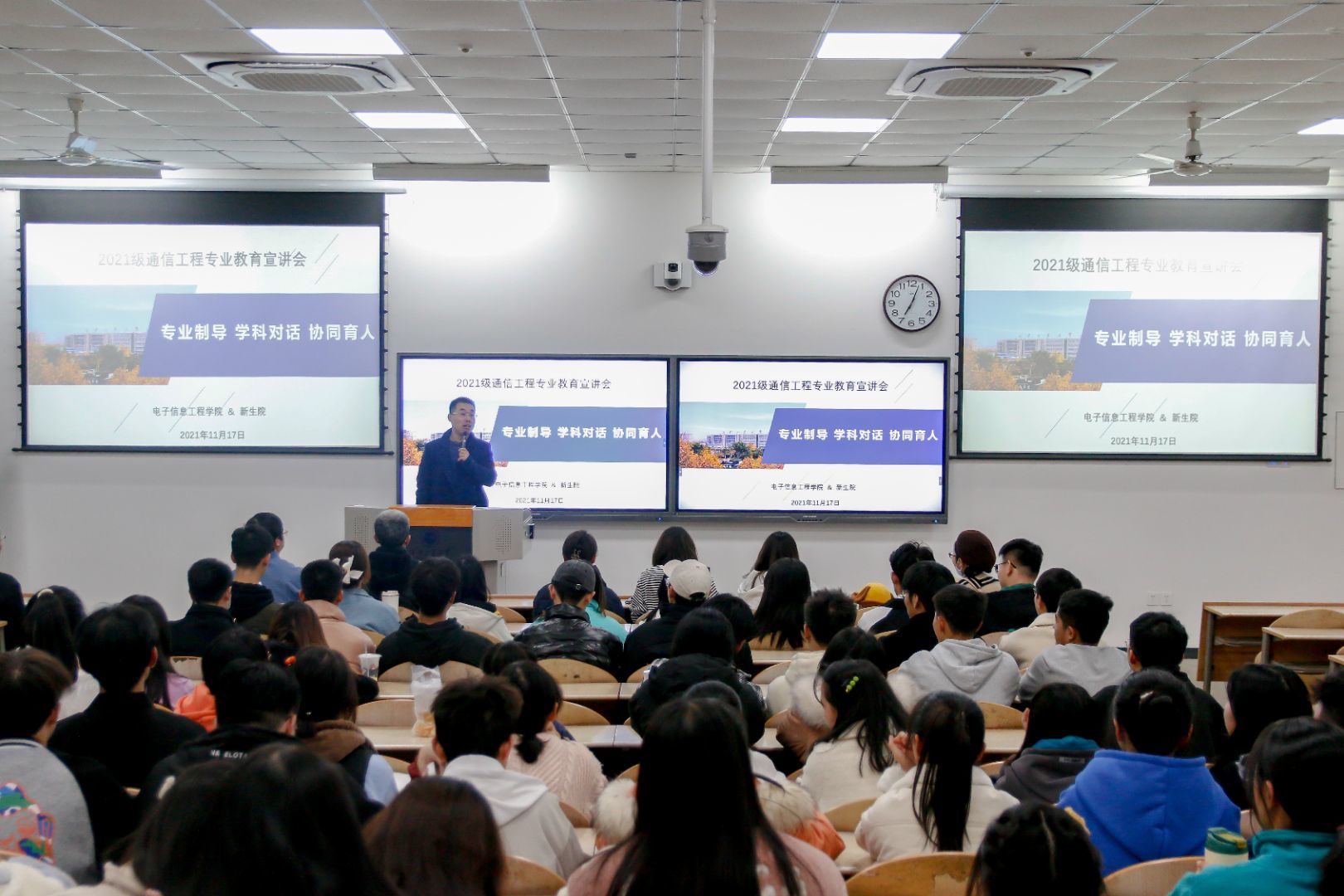 会议伊始,通信工程系资深主任雷斌老师用通俗易懂的语言介绍了通信工程专业的历史渊源,从三个方面为大家做了专业指导。首先讲述了通信工程的早期三大专业分别以及后期在不断的改进,及专业方方面面的改进细分精化,以及通信工程在我国现处的地位做出了详细的介绍;其次讲述了通信技术深入到其他领域的研发当中,其中主要介绍了光测、雷测、遥测方面在武器兵工领域的应用,并给同学们讲述了50年代到80年代的枪弹、炮弹及火箭弹结合通信专业知识的研发;第三讲述了通信技术与实地工厂进行项目研究,举例了202所,212所,203所反坦克导弹等武器的研究,具体阐述了雷达在武器装备方面的应用。鼓励学生珍惜当下学习机会,为专业课的学习打下坚实基础。