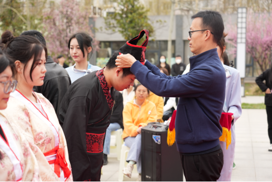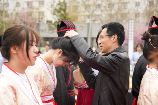 伴着礼乐,学生身着传统汉服入场。师长为学子依次加冠、加笄,标志着他们正式跨入成人行列。学子集体行感恩礼,感师长教诲之恩。学子代表领誓,铮铮誓言,师友为证,自此发奋图强。优秀学生代表、十佳大学生夏维婷发言,寄语新生不负韶华,只争朝夕,砥砺奋进。