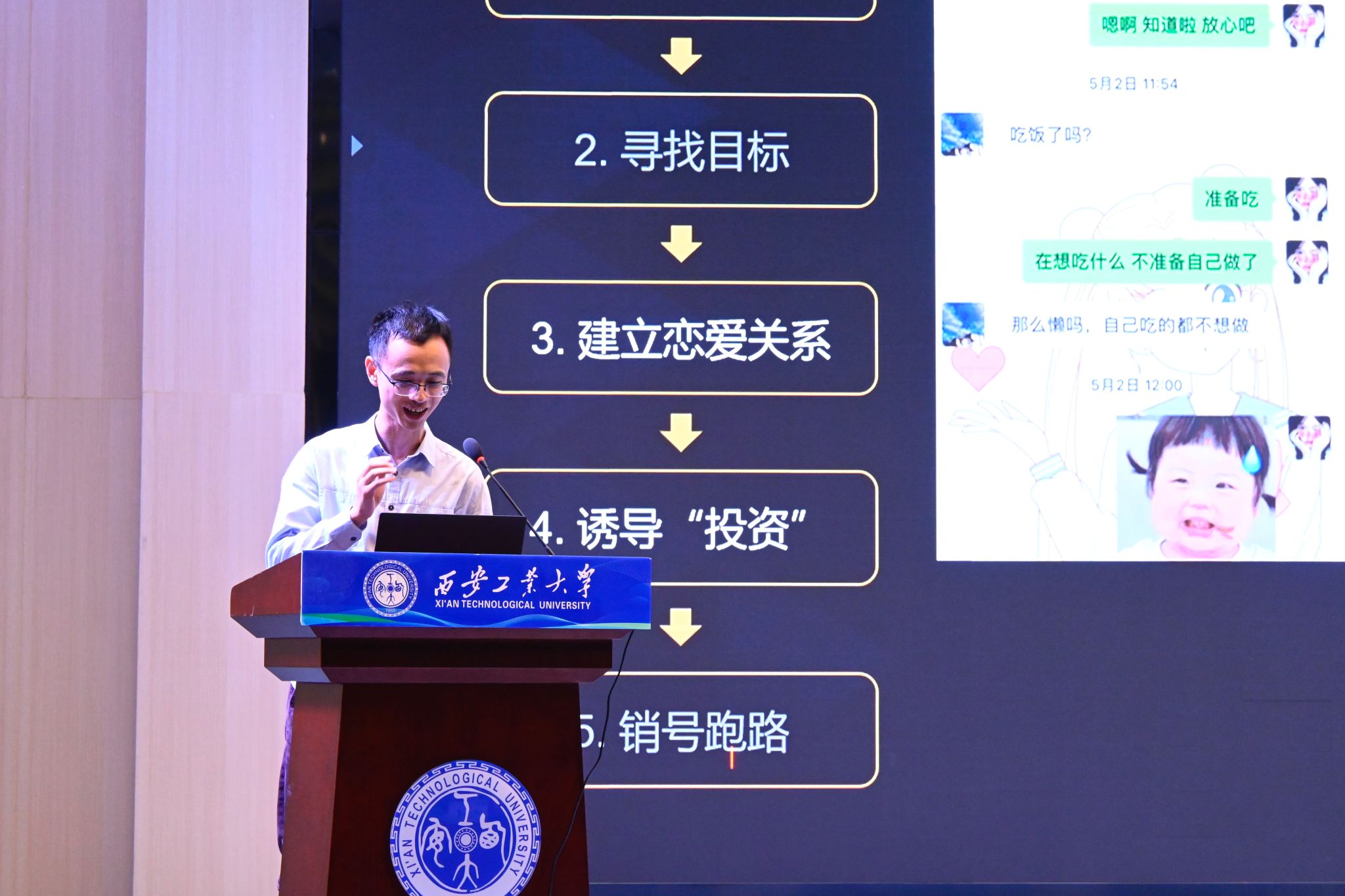随后,李辉结合案例为大家介绍了兼职刷单、注销网贷、裸聊裸贷、杀猪盘等典型诈骗类型及套路,并讲述了电诈分子身份隐藏技术以及反套路策略,提醒大家理性应对金融风险。王开拓为大家普及了有关电信诈骗的法律知识,结合相关真实案例讲述防范技巧,告诫大家切莫贪图小利。