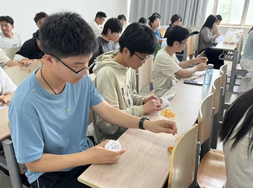 随后进入动手实践环节,老师详细演示了扎染的具体步骤:先将白色棉布折叠、扭曲或捆绑,用皮筋、线绳固定出各种造型;接着调配染料,把捆扎好的布料放入染液中浸泡;等待一段时间后取出、拆线、漂洗、晾干。同学们按照老师的指导,认真地操作起来。有人将布料紧紧缠绕成螺旋状,有人把它折成整齐的方块,还有人尝试用不同的捆绑方式创造独特的图案。