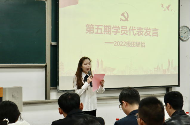第五期党课学员代表田思怡代表全体学员做出郑重承诺:珍惜机会,努力学习,遵守纪律,不断提高自身政治素质和理论修养,积极向党组织靠拢。