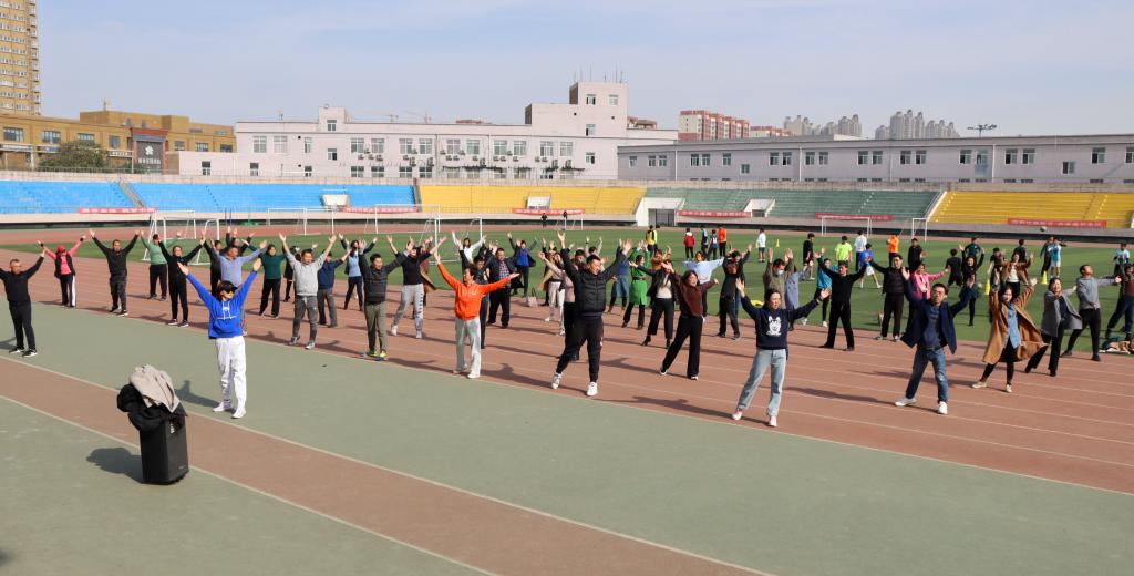 2021年11月15日中午12:40,初冬暖阳晴空碧,草莓视频 工会组织全体老师参加“健康体魄,庆祝建党100周年”第九套广播体操活动。